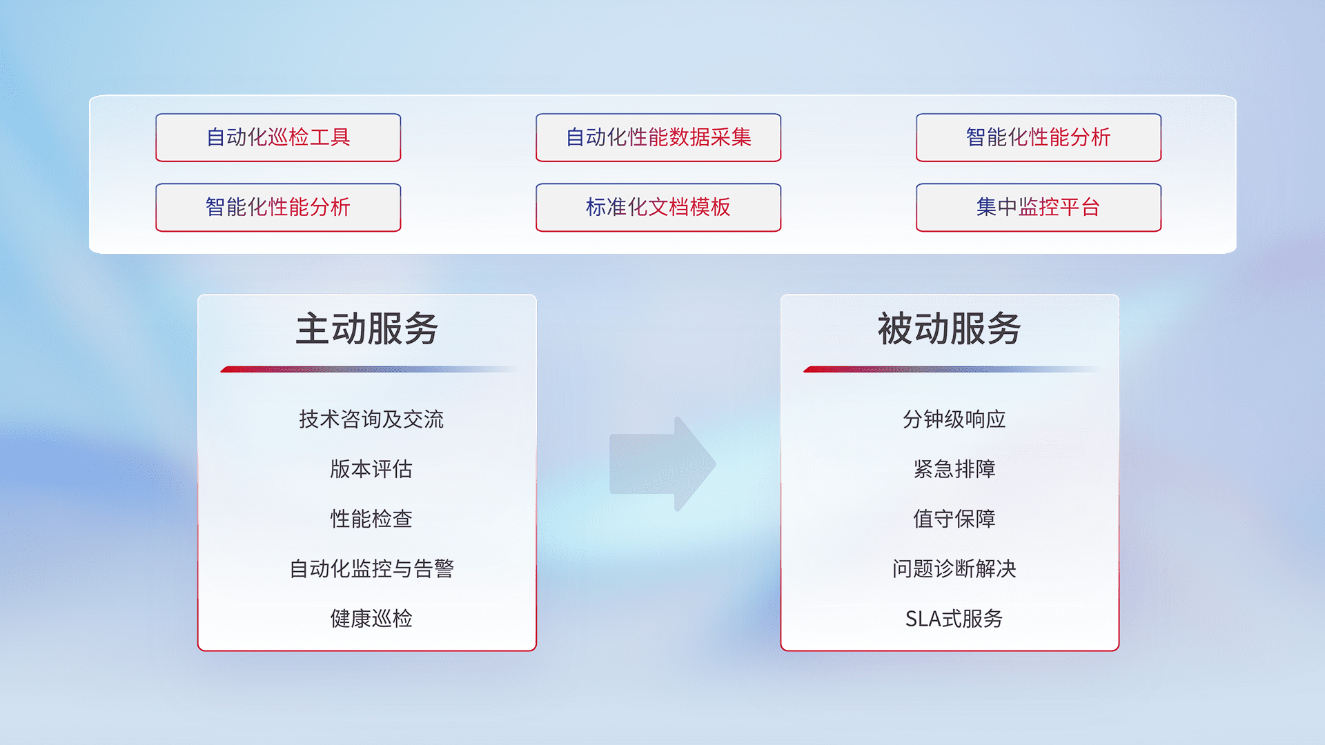 智能化工具和标准化文档,,,保障服务质量,,,提供主动服务(包含技术咨询、、、版本评估、、性能检查、、、自动化监控与告警、、、、健康巡检)和被动服务包含(分钟级响应、、、紧急排障、、、值守保障、、、、问题诊断解决、、SLA服务)。。。。